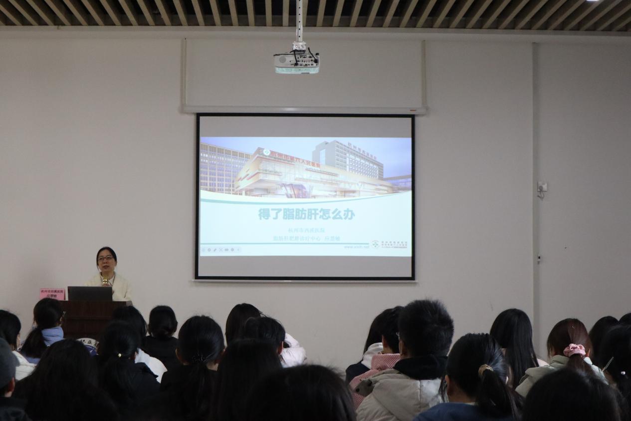 义诊活动结束后,杭州市西溪医院内分泌科主任医师应慧敏为师生带来了一场主题为“得了脂肪肝怎么办”的专题讲座。应慧敏以实际案例为切入点,深入浅出地讲解了脂肪肝的相关知识,强调了健康生活方式的重要性,分享了实用的健康小贴士,帮助师生更好地进行健康管理。